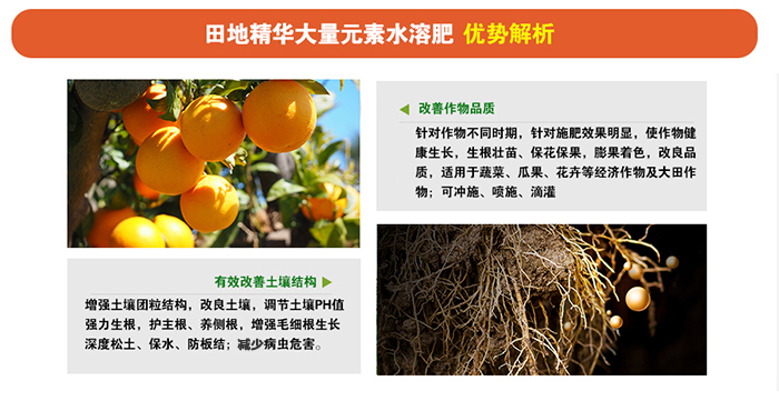 田地精華大量元素水溶肥料采用磷酸二氫鉀或礦源黃腐酸鉀為原料,特別添加海藻酸與螯合微量元素,根據作物生長階段所需營養設計配方,適合多種施肥方式,省時省力。